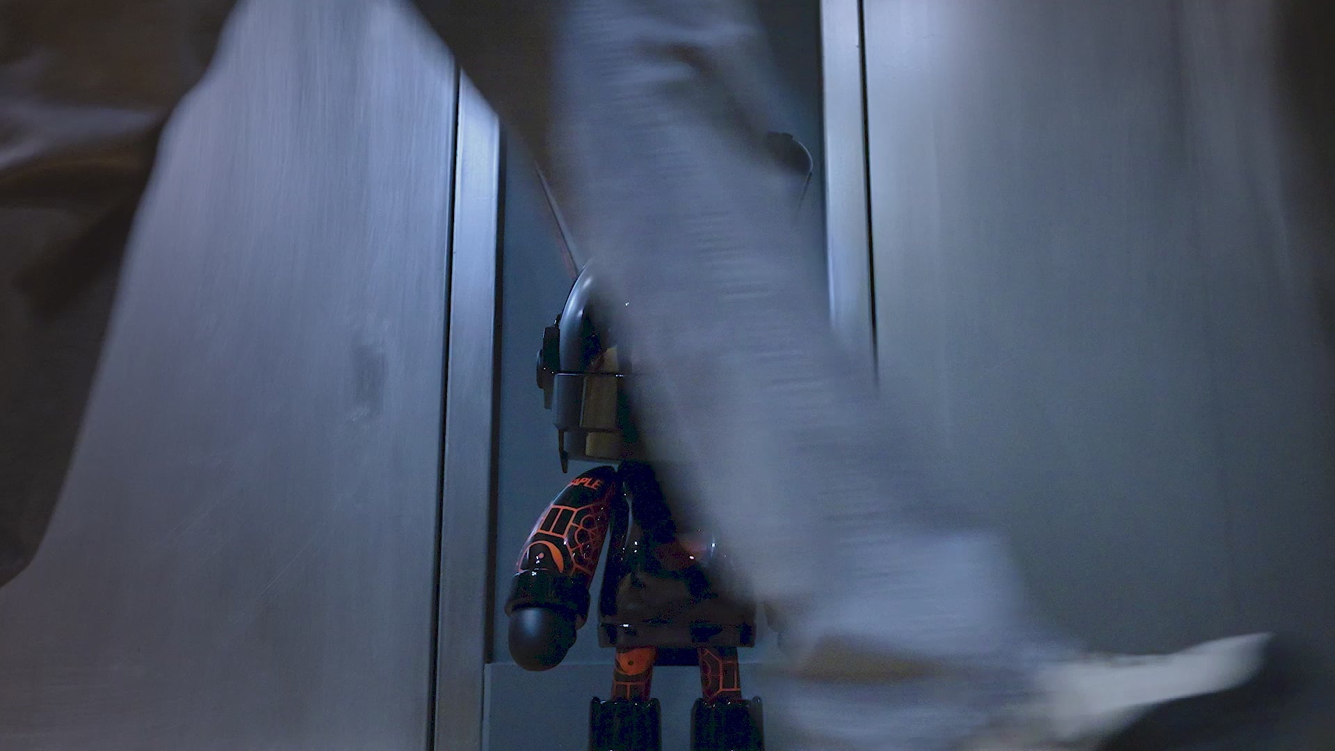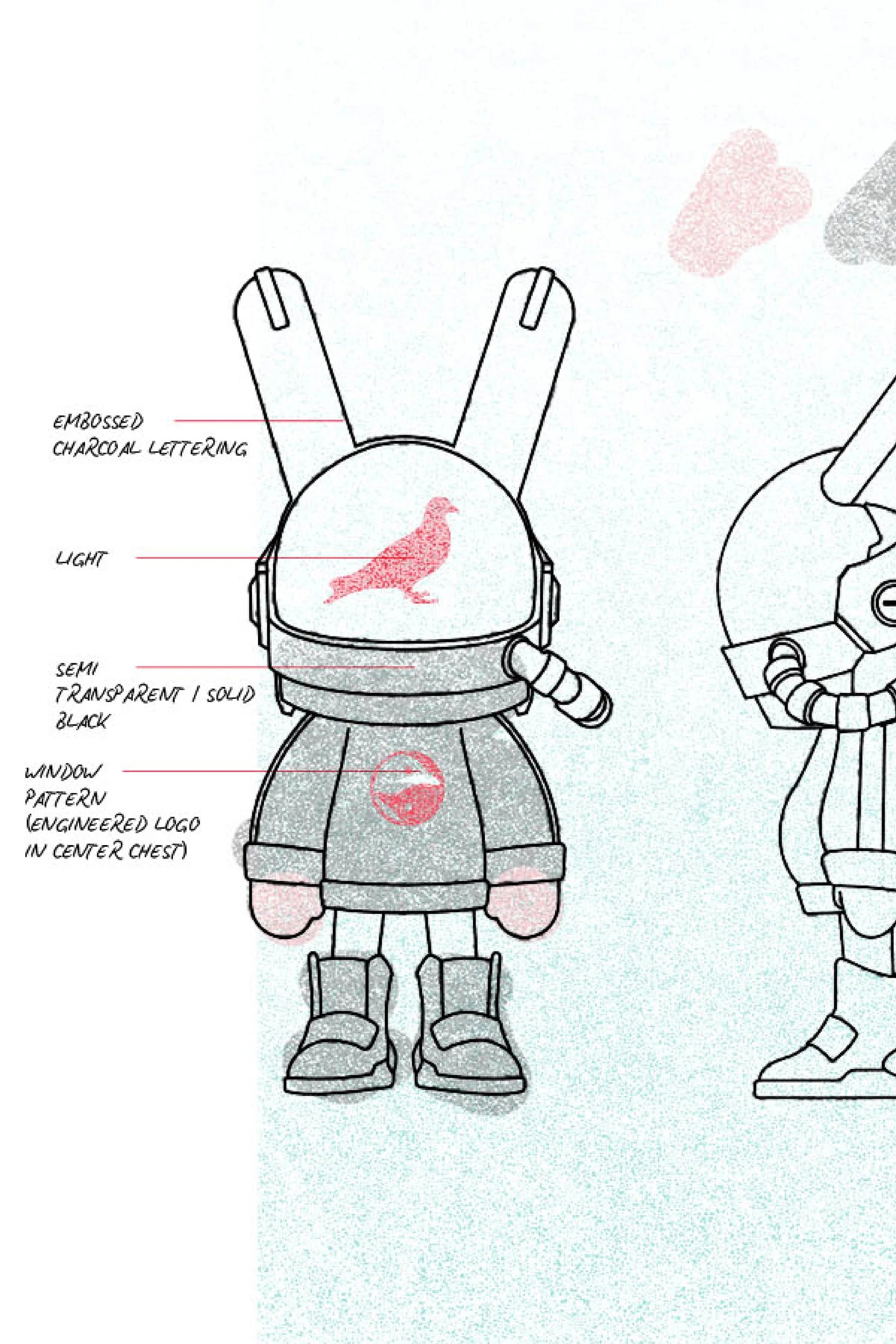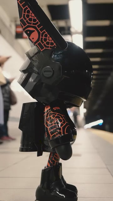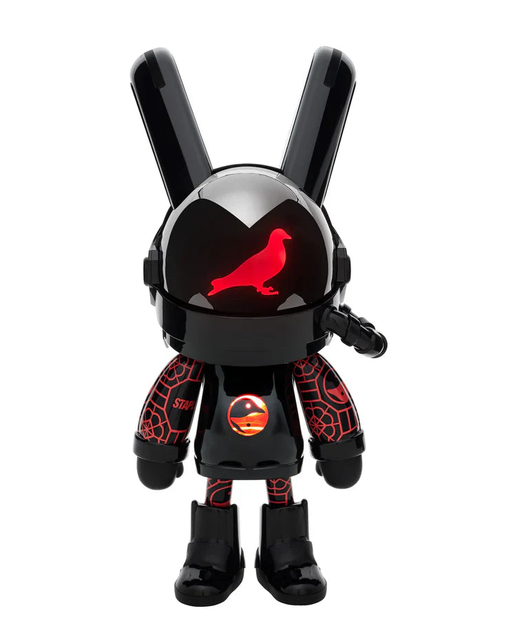 OUTFITTED IN A BLACK AND RED COLOR MOTIF, THE ROBBI FIGURE FEATURES AN INTERNAL LIGHT THAT ILLUMINATES A RED PIGEON INSIGNIA ON ITS HELMET.