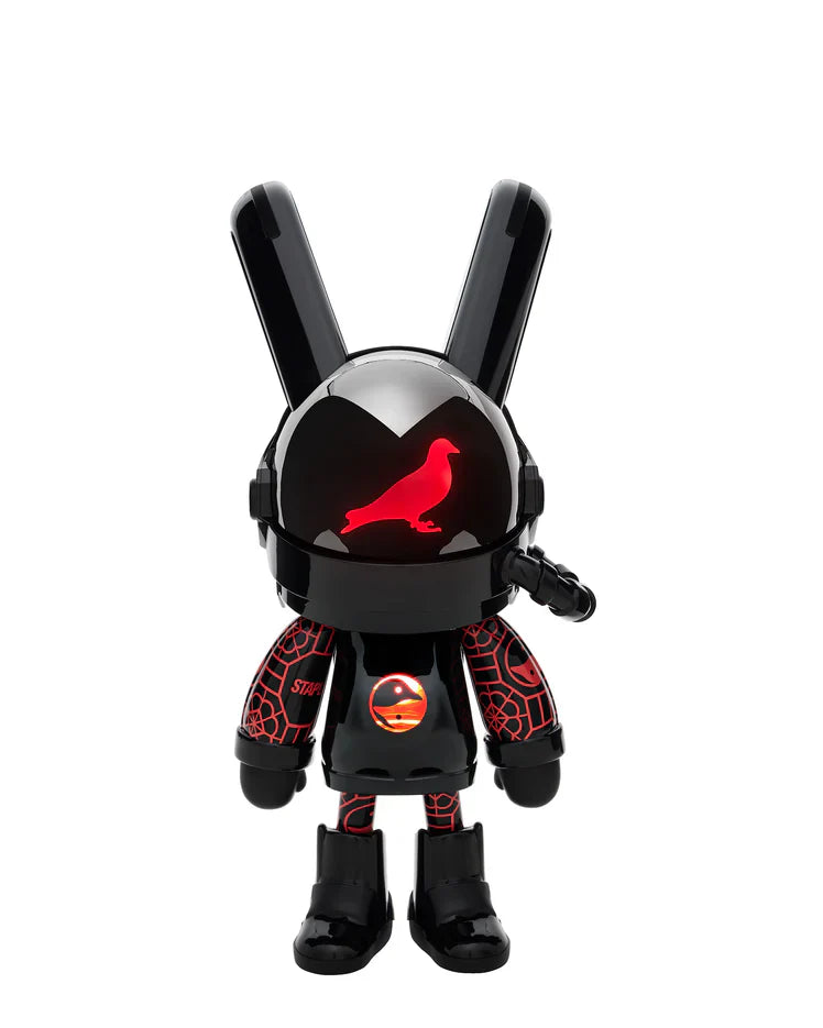OUTFITTED IN A BLACK AND RED COLOR MOTIF, THE ROBBI FIGURE FEATURES AN INTERNAL LIGHT THAT ILLUMINATES A RED PIGEON INSIGNIA ON ITS HELMET.